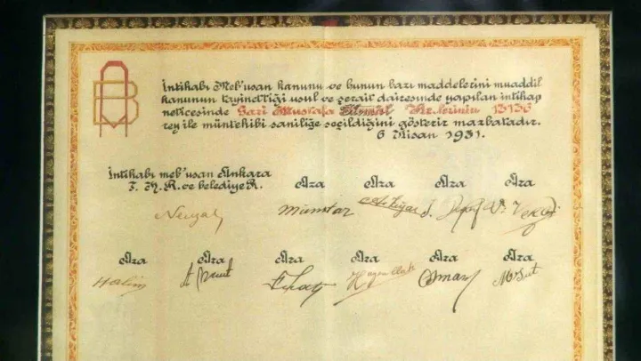 Mustafa Kemal Atatürk'ün 1931 yılında aldığı milletvekilliği mazbatası, önceki seçimlerde vatandaşlara posta yoluyla gönderilen seçmen kartı örneği de burada yer alıyor.