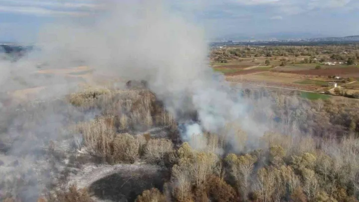 Bursa'da ormanlık alanda çıkan yangın rüzgarın etkisiyle büyüdü. İtfaiye ekipleri yangına uzun gayretleri sonucu yerleşim yerlerine sıçramadan kontrol altına alırken, yangın havadan görüntülendi.