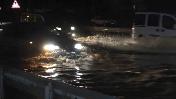 Bursa'nın merkez ilçelerinde etkili olan yağıştan dolayı rögarlar taştı, caddeler göle döndü.
