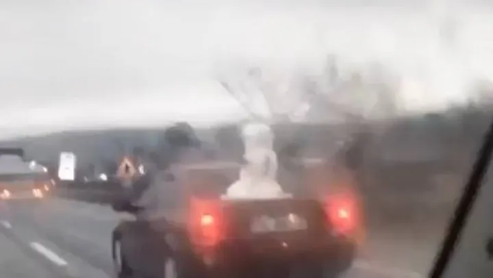Bursa şehir merkezine kar yağmayınca bir vatandaş otomobilinin bagajına yaptığı kardan adamı getirerek yollarda gezdi.