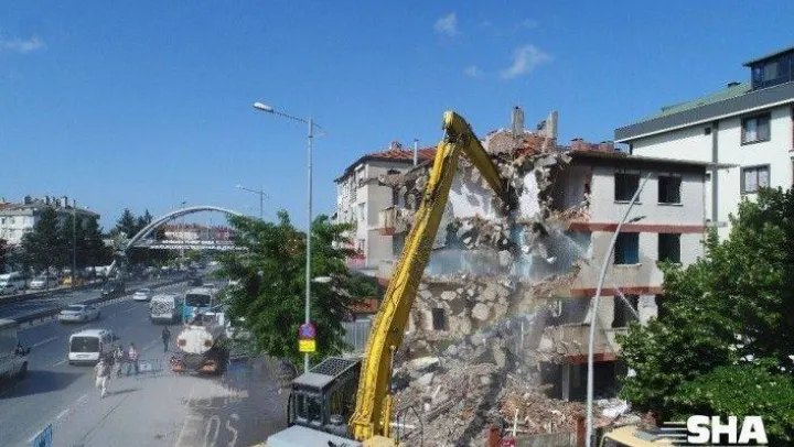 Büyükçekmece'de deprem riski taşıyan 6 konut ve 2 iş yeri belediye ekiplerince yıkıldı. Binanın yıkılma anı havadan görüntülendi.