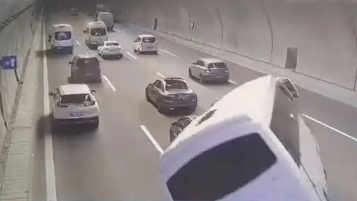 İstanbul'da Kuzey Marmara Otoyolu Cebeci Tüneli'nde 4 kişinin yaralandığı Çağlayan Adliyesi personelini taşıyan servisin kaza yaptığı anların güvenlik kamerası görüntüleri ortaya çıktı. Görüntülerde kontrolden çıkan aracın devrilerek sürüklendiği görülüyor.
