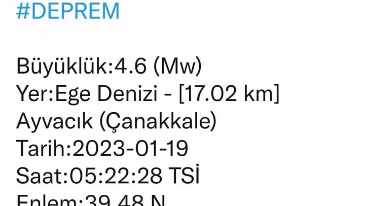 Afet ve Acil Durum Yönetimi Başkanlığı (AFAD) verilerine göre, saat 05.22 sıralarında Ege Denizi'nde 4,6 büyüklüğünde deprem meydana geldi. Çanakkale'nin Ayvacık ilçesinin 17,02 kilometre açığında meydana gelen depremin derinliği 7 kilometre olarak ölçüldü. Deprem, İzmir ve çevre illerden de hissedildi.