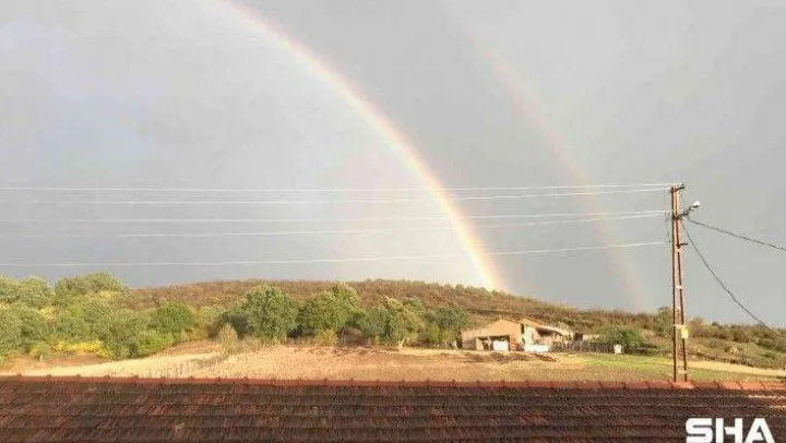 Çanakkale'nin Çan ilçesine bağlı Küçükpaşa köyü ile Büyükpaşa köyü arasında gökyüzünde oluşan çifte gökkuşağı manzarası görenleri heyecanlandırdı.