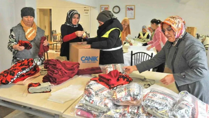 Canik Belediyesi Hanım Konakları'nda bulunan atölyelerde kursiyerler, usta öğreticiler ve ilçede yaşayan gönüllü kadınlar tarafından depremden etkilenen vatandaşların giyim ihtiyaçlarını karşılamak için üretilen kışlık giyim ürünleri ve battaniyeler deprem bölgesine gönderiliyor. Canikli kadınlar tarafından el birliğiyle hazır hale getirilen ürünler Canik Belediyesi tarafından AFAD koordinasyonunda Canik'ten deprem bölgesine gönderilen yardım tırlarıyla depremzedelere ulaşmak üzere yola çıkıyor.