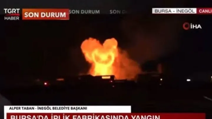 Bursa'nın İnegöl ilçesi Mareşal Fevzi Çakmak Caddesi'nde bulunan bir mobilya fabrikasında dün saat 16.25 sıralarında yangın çıktı. Rüzgarın şiddetiyle artan alevler 10 fabrikayı da kullanılamaz hale getirirken, yangına havadan ve karadan müdahale devam ediyor. İnegöl Belediye Başkanı Alper Taban sıcak bölgede canlı yayında İHA muhabirine bilgileri aktarırken patlama meydana geldi. Patlama anı canlı yayına saniye saniye yansıdı.