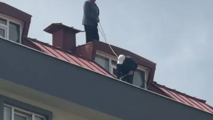Olay, dün Beylikdüzü Adnan Kahveci Mahallesi'nde yaşandı. Bir binanın çatısına tadilat yapmak için çıkan adam, başka birinin tuttuğu ve beline bağladığı iple güvenlik önlemi aldı. Çatıdan düşme tehlikesine aldırmadan işine devam eden şahsın o anları ise bir vatandaşın cep telefonunu kamerasına yansıdı.