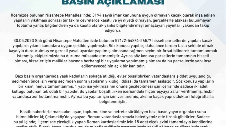 Çekmeköy Belediyesi'nin açıklamasında 'İlçemizde bulunan Nişantepe Mahallesi'nde; 3194 sayılı imar kanununa uygun olmayan kaçak olarak inşa edilen yapıların yıkılması sonrası bir takım çevrelerce kasıtlı ve iyi niyetli olmayan, gerçeklerle alakası bulunmayan, toplumu yanlış bilgilendiren ya da kasıtlı olarak yanlış bilgilendirmeyi amaçlayan yayınları yakından takip ediyoruz.