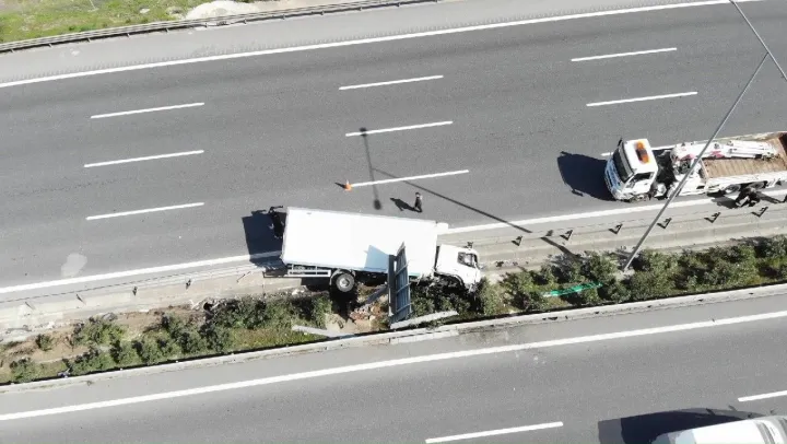 Çekmeköy'de seyir halindeki kamyon virajı alamayarak önce bariyerlere çarptı, ardından yan yattı. Kazada kamyon sürücüsü yaralandı.