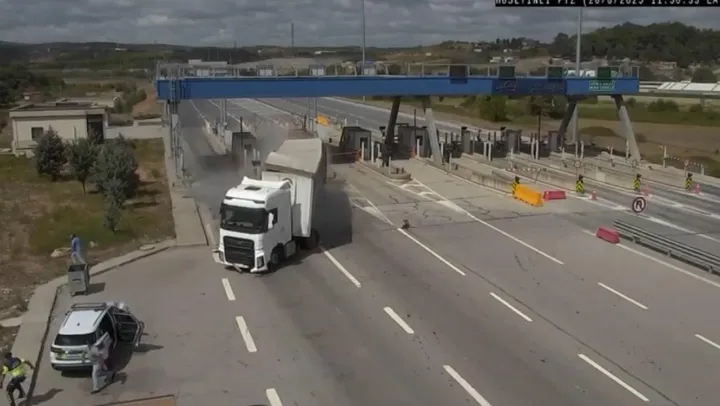İstanbul'un Çekmeköy ilçesinde, gişelerde meydana gelen trafik kazası güvenlik kamerasına saniye saniye yansıdı. Kontrolden çıkan tırın hızla gişelere girdiği, ardından park halindeki jandarma aracına çarptığı anlar kameraya yansıdı.