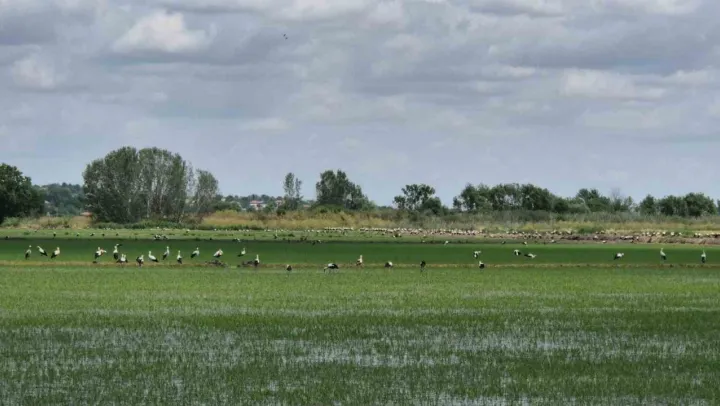 Kırklareli'nin Lüleburgaz ilçesinde leylek sürüleri çeltik tarlalarına akın etti, tarlalar adeta beyaz örtüyle kaplandı.