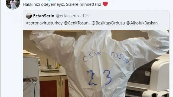 Bir sağlık çalışanın beyaz tulumunun arkasına 'Cenk Tosun 23' yazdığı fotoğrafı paylaşan milli futbolcu, 'Hakkınızı ödeyemeyiz. Sizlere minnettarız' ifadelerine yer verdi. Bu paylaşım kısa sürede binlerce beğeni aldı.