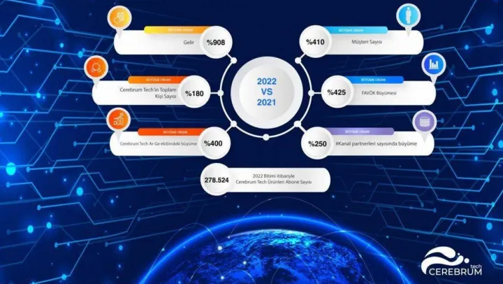 Türkiye merkezli olarak global düzeyde faaliyet yürüten Cerebrum Tech'in Kurucusu ve Yönetim Kurulu Başkanı Dr. Erdem Erkul, 'Yüksek katma değerli teknolojilerin ekonomiye katkısı da yüksek oluyor. Türk teknoloji girişimleri dünya pazarında varlığını hissettiriyor. Dijital dönüşüme ve sürdürülebilirlik çözümlerine odaklanan şirketlerin rekabet gücünün arttığını görüyoruz. 2022 yılını gelirimizde yüzde 908'lik bir artışla kapattık. Müşteri sayımızda ise yüzde 410 büyüme yaşadık. Tüm dünyada ürünlerimizi müşteriye ulaştıran kanal ortaklarımızı 2,5 kat artırdık. Yıl sonu itibarıyla ürünlerimizin abone sayısı da 278 bini geçti. Şirketimizin FAVÖK oranı da yüzde 425 olarak gerçekleşti. Ülkemizde teknolojiye yapılan yatırımlar ihracatı ve büyümeyi destekleyerek karşılığını veriyor' dedi.