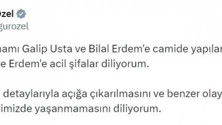 İstanbul'da Fatih Camii İmamı Galip Usta'ya yönelik saldırıya ilişkin sosyal medya hesabından açıklamada bulunan CHP Genel Başkanı Özgür Özel, 'Fatih Camii İmamı Galip Usta ve Bilal Erdem'e camide yapılan saldırıyı kınıyor, Usta ve Erdem'e acil şifalar diliyorum. Saldırının tüm detaylarıyla açığa çıkarılmasını ve benzer olayların bir daha ibadethanelerimizde yaşanmamasını diliyorum' ifadelerini kullandı.