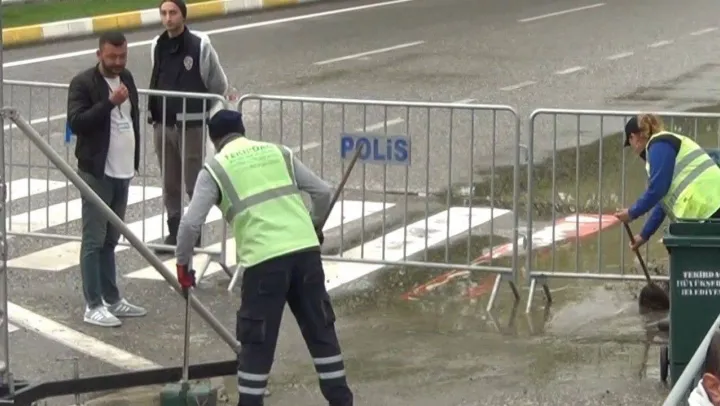 Kemal Kılıçdaroğlu'nun Tekirdağ'da düzenlediği miting öncesinde etkili olan yağış yüzünden miting alanı göle döndü. Tekirdağ Büyükşehir Belediyesi işçileri ise, biriken suları kürek ve süpürgeyle alandan uzaklaştırmaya çalıştı.