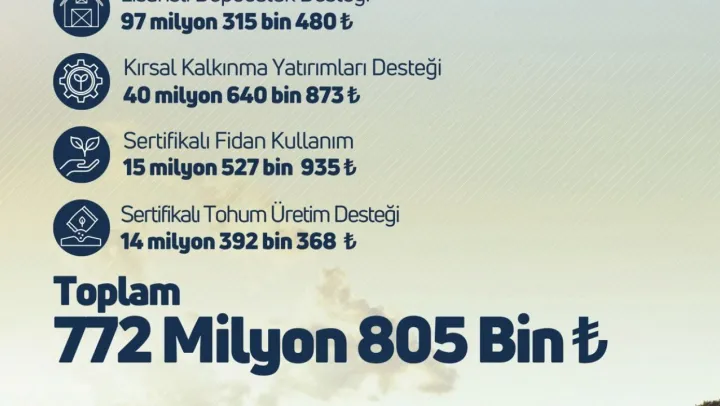 Tarım ve Orman Bakanlığı tarafından 604 milyon 928 bin 344 lira küçükbaş hayvancılık desteği, 97 milyon 315 bin 480 lira lisanslı depoculuk desteği, 40 milyon 640 bin 873 lira değerinde kırsal kalkınma yatırımları desteği, 15 milyon 527 bin 935 lira değerinde sertifikalı fidan kullanım desteği ve 14 milyon 392 bin 368 lira değerinde sertifikalı tohum üretim desteği olmak üzere toplam 772 milyon 805 bin liralık çiftçilere destek verilecek. Tarım ve Orman Bakanı İbrahim Yumaklı konuya ilişkin yaptığı açıklamada, 'Sürdürülebilir üretim için çiftçilerimizi destekliyor, üretim gücümüze güç katıyoruz. 772 milyon 805 bin TL tarımsal destek ödemesini bugün çiftçilerimizin hesaplarına aktarıyoruz. Hayırlı ve bereketli olsun' ifadelerini kullandı.