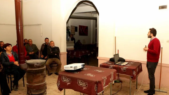 Nilüfer Belediyesi tarafından Tahtalı Mahallesi'nde düzenlenen eğitimde çiftçiler, 'Meyve Türlerinde Yeni Terbiye Sistemi: UFO' hakkında bilgilendirildi.