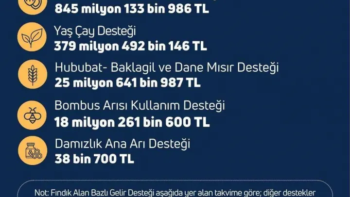 "Fındık alan bazlı gelir desteği 845 milyon 133 bin 986 lira. Yaş çay desteği 379 milyon 492 bin 146 lira. Hububat-baklagil ve dane mısır desteği 25 milyon 641 bin 987 lira. Bombus arısı kullanım desteği 18 milyon 261 bin 600 lira. Damızlık ana arı desteği ise 38 bin 700 lira."