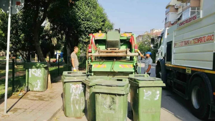 Körfez Belediyesi, mahallelerdeki çöp konteynerlerini kötü koku ve bakterilere karşı düzenli olarak dezenfekte ediyor.