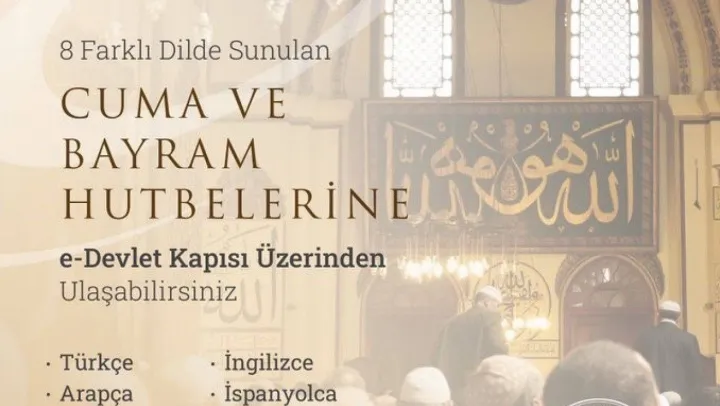 Diyanet İşleri Başkanı Ali Erbaş, X sosyal medya hesabından yaptığı açıklamada, Cumhurbaşkanlığı Dijital Dönüşüm Ofisi işbirliğiyle gerçekleştirilen çalışma çerçevesinde başkanlığın cuma ve bayram hutbelerinin 8 dil seçeneği ile artık e-Devlet Kapısı'nda yer alacağını belirterek, 'Vatandaşlarımız, 'http://diyanet.gov.tr' web sitemizde olduğu gibi e-Devlet Kapısı'ndan da hutbelerimize ulaşabilecekler. Hayırlı olsun' ifadesine yer verdi.
