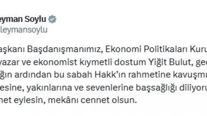 TBMM İçişleri Komisyonu Başkanı ve AK Parti İstanbul Milletvekili Süleyman Soylu sosyal medya hesabından yaptığı açıklamada, 'Cumhurbaşkanı Başdanışmanımız, Ekonomi Politikaları Kurulu Üyesi, gazeteci-yazar ve ekonomist kıymetli dostum Yiğit Bulut, geçirdiği elim bir hastalığın ardından bu sabah Hakk'ın rahmetine kavuşmuştur. Kederli ailesine, yakınlarına ve sevenlerine başsağlığı diliyorum. Allah rahmet eylesin, meknı cennet olsun' dedi.