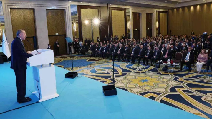 Erdoğan, Türkiye Yüzyılı vurgusu yaparak,' Biz, Türkiye'nin çıkarları söz konusu olduğunda kimsenin kimliğine, kökenine bakmayız. Baktığımız tek yer ülkemize kazandırılan eserler milletimize yapılan hizmetlerdir. Hayatımızın hiçbir döneminde yatırımcı düşmanlığı ile siyaset yapmadık bundan sonra da yapmayız. Cumhuriyetimizin yeni yüzyılına geçmiş, eksikleri gidermiş, altyapısını kurmuş, bölgesel ve küresel gücümüzü tahkim etmiş olarak giriyoruz. Ülkemizi bu seviyeye getirmek için son 20 yılda verdiğimiz demokrasi ve kalkınma mücadelesinin sizler de şahidisiniz. Şimdi önümüzde adını Türkiye Yüzyılı dediğimiz yeni bir dönem açılıyor. İnşallah Türkiye Yüzyıl'ını da sizlerle birlikte inşa edeceğiz. Biraz önce yaşadığımız coğrafyanın güzelliklerinden, zenginliklerinden, potansiyelinden söz ederken elbette aynı coğrafyanın önümüze çıkardığı zorlukları da görmezden gelmiyoruz ülkemizi dört bir yanımızda süren krizlerin, çatışmaların, çekişmelerin dışında tutmak için gerçekten çok çalışıyoruz. Küresel dengeleri, bölgesel hassasiyetleri adeta kuyumcu terazisi titizliği ile ölçüyor, tartıyor politikamızı buna göre belirliyoruz' dedi.