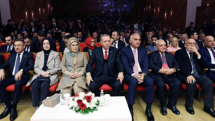 Türkiye'nin 1000 yıllık köklü bir birikime sahip olduğunu hatırlatan Cumhurbaşkanı Erdoğan, 'Bu milletler ekonomik ve sosyal buhranlar geçirse de ayakta kalır. Türk milletinin de ayakta kalabilmesinin sebebi bu kültürel hazinesidir. 1000 yıllık köklü bir birikime sahibiz' açıklamasını yaptı. Türkiye'nin kültür havzasının sınırlarının geniş alanlara yayıldığını kaydeden Erdoğan, 'Kültür ve sanat alanında vesayet zincirlerini parçaladıkça, ülke ve millet olarak çok daha büyük başarılara imza atacağımıza inanıyoruz' dedi. 'Dünyada eşi benzeri olmayan bir hazinemiz bulunuyor' diyen Erdoğan, Türkiye'de asırlardır farklı kimliklere ev sahipliği yapmış hoşgörü timsali illerin bulunduğunu ifade etti. Hangi ile gidilse insanlık tarihine ışık tutan tarihle karşılaşıldığını dile getiren Cumhurbaşkanı Erdoğan, 'Maziden atiye kurduğumuz bu kadim birikimi koruduğumuz sürece bizi kimse yolumuzdan alıkoyamaz. Sanat ve sanatçılarımız arasında asla ayrım yapmadan başarıyı desteklemenin çabası içerisindeyiz. Kültür ve Turizm Bakanlığı olarak Cumhurbaşkanımızın öncülüğünde yaptığımız çalışmalarımızda, kültürümüzü ve sanatımızı desteklemek için var gücümüzle çalışıp, her türlü adımı attık. Bu topraklara ait eserleri yurt dışından getirdik. Ecdadımızın emanetlerini ve eserleri ihya ettik. Çağın ihtiyaçlarına göre gelenekselle, modernliği yan yana getirdik. Geçtiğimiz hafta açtığımız Rami Kütüphanemiz, bu kültür sentezinin en güzel örneği oldu. Yaptığımız çalışmalarla kültür ve turizmimizin birbirini destekleyen, aynı zamanda güçlendiren bir eko sistem olmasını sağladık' diye konuştu.