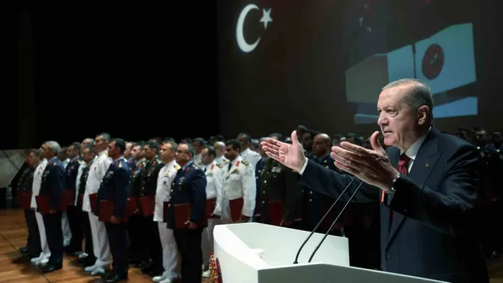 Büyük ve güçlü Türkiye'yi inşa etmenin en temel vazifeleri olduğunu vurgulayan Cumhurbaşkanı Erdoğan, 'Farklı kıtalara nizam veren idari ve siyasi teşkilatlanma kabiliyetimizi askeri taktik ve stratejilerimizle besledik, zenginleştirdik. İlk düzenli ve disiplinli ordumuzu bundan tam 2 bin 234 yıl evvel, milattan önce 209'da kurduk. Modern ordularla uygulanan onlu sistemi dünya askeri literatürüne 2 bin yıl önce biz hediye ettik. Alplerimizle, erenlerimizle, gazilerimizle fetih ve gaza ruhunu gönül coğrafyamızın dört bir yanına yayarken, istimalet anlayışımızla aynı zamanda kalpleri de fethettik. Bugün sert ve yumuşak gücün mükemmel terkibini ifade eden akil güç, ecdadımız tarafından istimalet politikası olarak yıllarca uygulandı. Sultan Fatih'in liderliğinde 1453'te topları etkin bir şekilde kullanarak yalnızca İstanbul'u fethetmekle kalmadık, aynı zamanda savaş konseptini de baştan aşağı değiştirdik. Lojistik yapılanmadan, sefer planlamasına, haritacılıktan, haber alma operasyonlarına, harp sahasına yeni bir ufuk kazandırdık. Muharip unsurların sevk ve idaresinde, taktik ve manevra kabiliyetinin geliştirilmesinde dünyada eşi benzeri olmayan yeniliklere imza attık. Değerli arkadaşlarım, bakınız şu örneği özellikle sizlerle paylaşmak istiyorum. Hadimü'l-Haremeyni'ş-Şerifeyn Yavuz Sultan Selim Han, Mısır Seferi sırasında 'geçilmez' denilen Sina Çölü'nü sadece 13 günde geçti. Kendisinden üç asır sonra Napolyon ordularının dahi geçemediği bu çölü üstün bir askeri zekayla tasarladığı ikmal ve su tedarik sistemiyle neredeyse hiçbir zayiat vermeden aşmayı başarmıştır. Aynı şekilde, Malazgirt Savaşı'nda Sultan Alparslan, Türk askeri dehasının bir başka örneği olan hilal taktiğini son derece başarılı bir şekilde uygulayarak Anadolu'nun kapılarını ardına kadar açmıştır. Hayat ve haysiyetimiz için çarpıştığımız, yedi düvele meydan okuduğumuz İstiklal Mücadelesi de hiç şüphesiz milletimizin iman ve cesaretinin yanı sıra, subaylarımızın feraset ve dehasıyla zafere ulaşmıştır. Bu zaferlerden biri de 26 Ağustos 1922'de Gazi Mustafa Kemal'in Büyük Taarruz'la başlayan ve 30 Ağustos'ta Başkomutan Meydan Muharebesi ile taçlanan harekatıdır. Subaylarımızı 'ordunun ruhu' olarak tanımlayan Gazi Mustafa Kemal bu harekata ilişkin şu değerlendirmeyi yapmıştır; 'Her safhasıyla düşünülmüş, hazırlanmış, idare edilmiş ve zaferle sonuçlandırılmış olan bu harekat, Türk ordusunun, Türk subay ve komuta heyetinin yüksek kudret ve kahramanlığını tarihe bir kere daha geçiren muazzam bir eserdir'. Her sayfasını zaferle, erdemle, hakkaniyetle süslediğimiz köklü tarihimiz askeri deha ve kabiliyet anlamında daha nice başarılarla doludur. Şehit ve gazilerimizden emanet aldığımız bu toprakları çok daha güçlü bir şekilde geleceğe taşımak, büyük ve güçlü Türkiye'yi inşa etmek bizim en temel vazifemizdir. Çalışmalarımızı şanlı mazimizden aldığımız güç ve cesaretle, milletimize duyduğumuz sarsılmaz güvenle, işte bu istikamette sürdürüyoruz' diye konuştu.