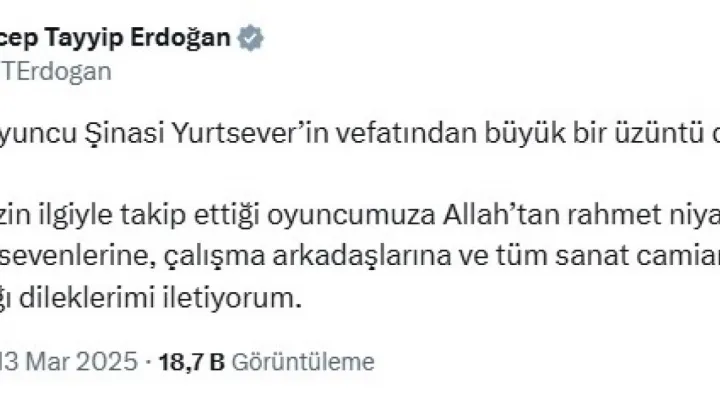Cumhurbaşkanı Recep Tayyip Erdoğan, hayatını kaybeden Oyuncu Şinasi Yurtseven için sosyal medya hesabından taziye mesajı paylaştı. Erdoğan mesajında, 'Değerli oyuncu Şinasi Yurtsever'in vefatından büyük bir üzüntü duydum. Milletimizin ilgiyle takip ettiği oyuncumuza Allah'tan rahmet niyaz ediyor; ailesine, sevenlerine, çalışma arkadaşlarına ve tüm sanat camiamıza başsağlığı dileklerimi iletiyorum' dedi.
