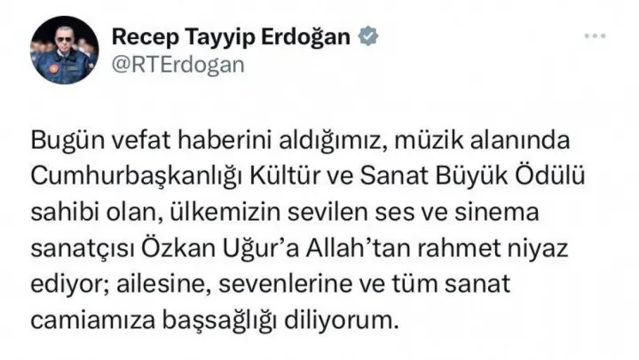 MFÖ grubunun üyelerinden sanatçı Özkan Uğur, 69 yaşında hayatını kaybetti. Uğur'un vefatı sonrasında Cumhurbaşkanı Erdoğan sosyal medya hesabından başsağlığı mesajı yayımladı. Erdoğan, mesajında 'Bugün vefat haberini aldığımız, müzik alanında Cumhurbaşkanlığı Kültür ve Sanat Büyük Ödülü sahibi olan, ülkemizin sevilen ses ve sinema sanatçısı Özkan Uğur'a Allah'tan rahmet niyaz ediyor; ailesine, sevenlerine ve tüm sanat camiamıza başsağlığı diliyorum.' ifadelerine yer verdi.