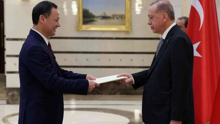Cumhurbaşkanlığı Külliyesi'ndeki kabulde Kırgızistan Büyükelçisi Ruslan Kazakbaev, Cumhurbaşkanı Erdoğan'a güven mektubu sundu. Kazakbaev'in eşi, çocukları ve bazı büyükelçilik mensuplarının Cumhurbaşkanı Erdoğan'a takdiminin ardından hatıra fotoğrafı çektirildi.