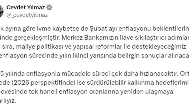 Cumhurbaşkanı Yardımcısı Cevdet Yılmaz, Hazine ve Maliye Bakanı Mehmet Şimşek'in paylaşımını alıntılayarak yaptığı paylaşımda, 'Ocak ayına göre ivme kaybetse de şubat ayı enflasyonu beklentilerin üstünde gerçekleşmiştir. Merkez Bankamızın ilave sıkılaştırıcı adımlarının yanı sıra, maliye politikası ve yapısal reformlar ile destekleyeceğimiz dezenflasyon sürecinde yılın ikinci yarısında belirgin sonuçlar alınacaktır. 2025 yılında enflasyonla mücadele süreci çok daha hızlanacaktır. Orta vadede (2026 perspektifinde) ise sürdürülebilir kalkınma hedeflerimiz çerçevesinde tek haneli enflasyon oranlarına yeniden ulaşmaya kararlıyız' ifadelerini kullandı.