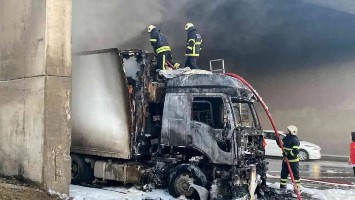 Kocaeli'nde D-100 karayolunda seyir halindeki çay yüklü tırın dorsesi alev aldı. Yangını fark ederek yardım isteyen sürücü, dorse ve aracın küle dönmesine engel olamadı.