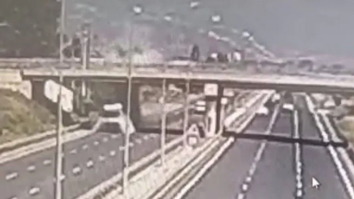 Öte yandan, kaza anı bir iş yerinin güvenlik kamerasına saniye saniye yansıdı. Kamyonun açık kalan damperinin çarptığı üst geçitte sıkıştığı ve kamyonun bariyerleri aşıp karşı yönden şarampole uçtuğu, karşı yönden gelen araçların zorlukla durduğu anlar yer aldı.