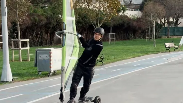 Bakırköy'de bir sörf tutkunu, lodosu fırsata çevirdi. Kaykaya monte ettiği yelkenle karada sörf yapan genç, kameralara yansıdı.