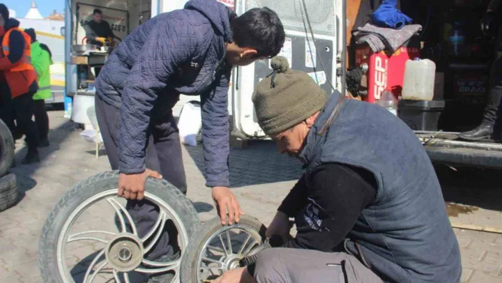 Adıyaman'a giden birçok kurumun hizmet araçlarının patlayan lastiklerini gönüllüler tamir ediyor.