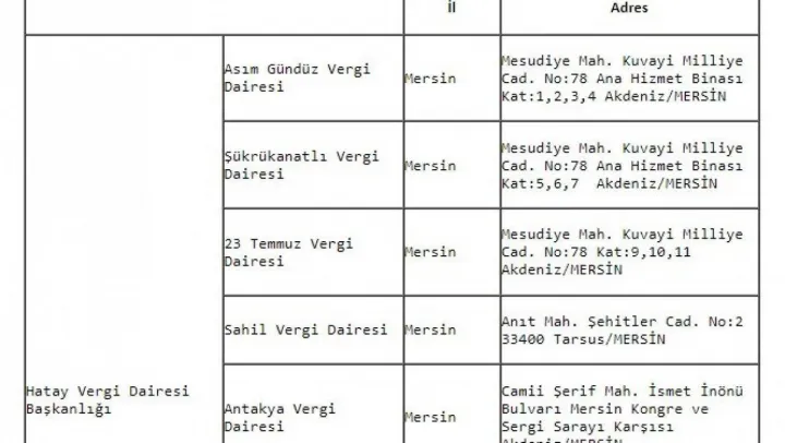 Buna göre, Hatay Vergi Dairesi Başkanlığına bağlı Asım Gündüz, Şükrü Kanatlı, 23 Temmuz, Sahil, Antakya, Kırıkhan, Reyhanlı, Samandağ ve Akdeniz vergi daireleri Mersin'de, Kahramanmaraş Vergi Dairesi Başkanlığına bağlı Aslanbey, Elbistan, Afşin, Pazarcık, Aksu vergi daireleri Kayseri'de, Adıyaman Defterdarlığı Sivas'ta, Gaziantep Vergi Dairesi Başkanlığına bağlı İslahiye Vergi Dairesi Şehitkamil ilçesinde, Şanlıurfa Vergi Dairesi Başkanlığına bağlı Şehitlik, Topçu Meydanı, Göbeklitepe, Birecik vergi daireleri Siverek, Viranşehir ve Suruç'ta, Malatya Vergi Dairesi Başkanlığına bağlı Fırat ve Beydağı vergi daireleri Kayseri'de, Osmaniye Defterdarlığına bağlı Kadirli Vergi Dairesi de Osmaniye'de Adnan Menderes Mahallesi'nde hizmet verecek.