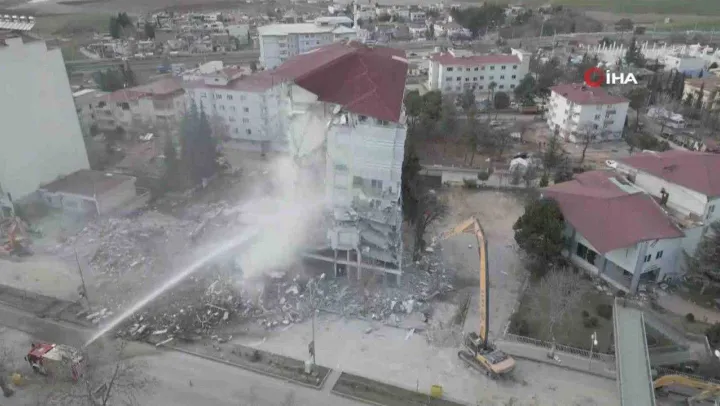 6 Şubat sabah saat 04.17'de 7,7 büyüklüğünde meydana gelen depremin merkez üssü Kahramanmaraş'ın Pazarcık ilçesinde deprem çalışmaları devam ediyor. Bu kapsamda, ilçede bulunan binaların artçı sarsıntılarda beklenmedik bir zamanda yıkılmaması için kontrollü yıkım çalışmaları başladı. Apartmanlar, yıkım sorumlusu gözetiminde, toz olmaması için enkaza su sıkan itfaiye ekipleri eşliğinde vinçlerle yıkılıyor. İlçenin girişinde bulunan 10 katlı bir apartmanın yıkımı havadan görüntülendi.