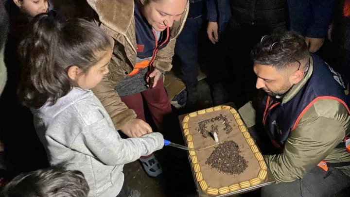 Kahramanmaraş merkezli deprem sonrası İzmir'den deprem bölgesine hareket eden Konak Nevvar Salih İşgören Eğitim Kampüsü-5 Mesleki Teknik Anadolu Lisesinin mutfak ekibi, Kahramanmaraş'ın Türkoğlu ilçesi Kınılı Mahallesi'ndeki afet çadırında depremzedelere yemek yapıyor. Ekip, depremde evleri yıkılan ve ailesiyle çadırda kalan 9 yaşındaki Gülsima Güler'e doğum günü sürprizi yaptı. Mehmet Dayıoğlu, Duygu Dayıoğlu, Zeki Birkan Uz, Nasuh Dumlupınar ve Serdar Bozkurt'tan oluşan mutfak ekibi önce pastayı özenle hazırladı, ardından çadır alanına giderek Gülsima'ya sürpriz yaptı. Gülsima, pastadaki mumu üflerken dilek de tuttu. O anlar, mutfak ekibinin cep telefonu kameralarına yansıdı.