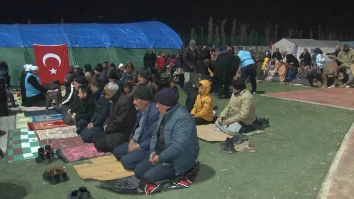 Adıyaman'da depremzedeler çadır kentte saf tutarak, Miraç Kandili'nde dua edip, namaz kıldı.
