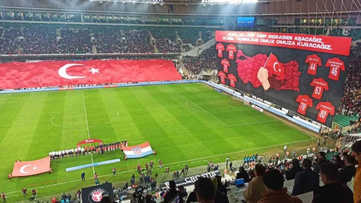 2024 Avrupa Şampiyonası Elemeleri D Grubu ikinci maçında A Milli Futbol Takımı, Hırvatistan'ı konuk ediyor. Bursa Büyükşehir Stadyumu kale arkası tribünde açılan koreografi depremden etkilenen illerin plaka kodlarının olduğu formalar yer aldı. Ayrıca koreografi de, 'Zorlukları hep beraber aşacağız. Güzel yarınları omuz omuza kuracağız' ifadeleri kullanıldı.