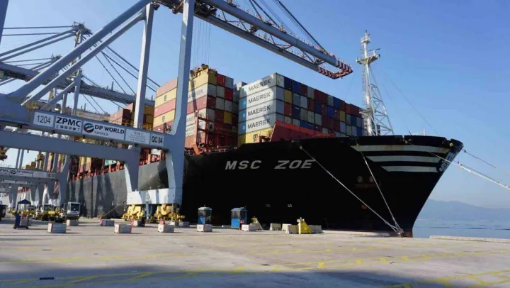 Sanayi ve liman kenti olarak kabul edilen Kocaeli'nin Körfez ilçesinde faaliyet gösteren DP World Yarımca Limanı, dünyanın en büyük konteyner gemileri arasında yer alan Panama bandıralı 'MSC Zoe' konteyner gemisini misafir ediyor. Uzakdoğu'dan gelen geminin ilk durağı DP World Yarımca Limanı oldu. 19 bin 224 TEU kapasiteli, 395.4 metre uzunluğundaki, 59 metre genişliğindeki gemi, dikkatle yapılan operasyonun ardından terminale yanaşarak indirme ve bindirme işlemine başladı. Dev gemi, başta sanayi sektörü olmak üzere birçok alandaki yüklerin bulunduğu konteynerlerin indirme ve bindirme işlemi tamamlandıktan sonra güzergahına devam edecek.