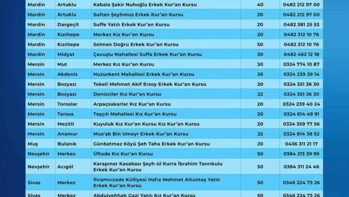 Diyanet İşleri Başkanlığı. Ankara, Antalya, Bolu, Bursa, Denizli, Elazığ, Erzurum, Eskişehir, İzmir, Kastamonu, Kayseri, Kocaeli, Konya, Kütahya, Manisa, Ordu, Rize, Samsun, Tekirdağ, Trabzon, Van ve Yozgat illeri olmak üzere 22 ildeki 23 Dini Yüksek İhtisas Merkezi'nde toplam 2 bin 521 deprem mağdurunun; Antalya'nın Aksu, Döşemealtı, Kepez, Muratpaşa, Alanya, Elmalı; Bingöl Merkez, Solhan, Karlıova; Bitlis Merkez, Tatvan; Erzincan Merkez; Kayseri Hacılar, Kocasinan, Melikgazi; Konya Akşehir, Beyşehir, Çumra, Emirgazi, Hadim, Kadınhanı, Karapınar, Karatay, Meram, Selçuklu, Seydişehir, Sarayönü; Mardin Artuklu, Dargeçit, Kızıltepe, Midyat; Mersin Mut, Akdeniz, Bozyazı, Toroslar, Tarsus, Mezitli, Anamur; Muş Bulanık; Nevşehir Merkez, Acıgöl; Sivas Merkez, Suşehri, Kangal; Niğde Merkez, Bor ilçeleri olmak üzere 12 ildeki 83 Kur'an kursunda toplam 3 bin 124 merkezi depremzedelerin hizmetine açtı.