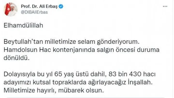 Diyanet İşleri Başkanı Ali Erbaş, resmi sosyal medya hesabından yaptığı açıklamada, hac kontenjanında salgın öncesi döneme geri dönüldüğünü belirterek, 65 yaş üstü dahil, 83 bin 430 hacı adayını kutsal topraklarda ağırlayacaklarını açıkladı. Erbaş'ın mesajında şu ifadeler yer aldı: