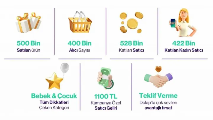 Türkiye'de paylaşım ekonomisi bilincinin artmasına da katkıda bulunan, Türkiye'nin önde gelen ikinci el ürün platformlarından Dolap, 'Kazandıran Alışveriş Günleri' ile ikinci el ürün pazarına katkı sağlamaya devam ediyor. 18-22 Eylül tarihlerinde gerçekleşen yılın en büyük kampanyalarından 'Kazandıran Alışveriş Günleri'ne ilişkin verilerini açıklayan platform, 5 gün boyunca süren kampanyada 500 bin adet ürün satışı gerçekleştiğini duyurdu. Platform, yeniden kullanım ile döngüsel ekonomiye de büyük katkı sağlarken, kampanyaya özel satıcı gelirinin ortalama 1100 TL, alıcı sayısını ise 400 bin olarak açıkladı.