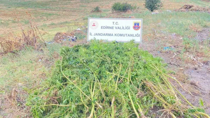 Edirne Jandarma Komutanlığı uyuşturucu madde ile mücadele faaliyetleri çerçevesinde bir tarlada ayçiçeği tarlasına gizlenmiş 450 kök kenevir ele geçirdi.