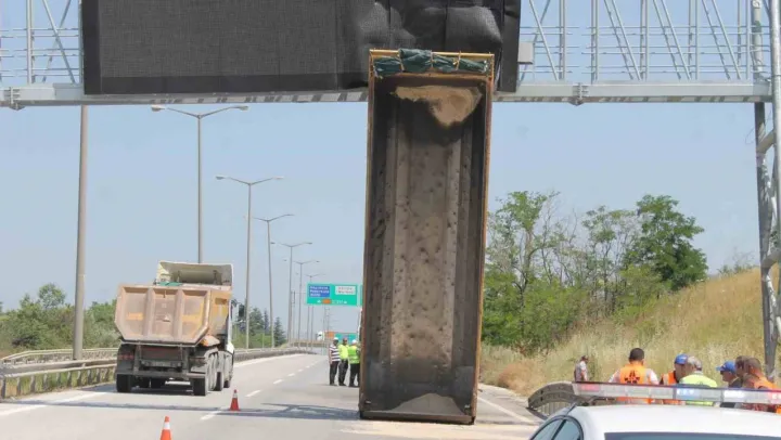 Edirne-Kapıkule Karayolu'nda damperi açık unutulan kamyonun yön tabelasına çarpması sonucu damper havada asılı kaldı.