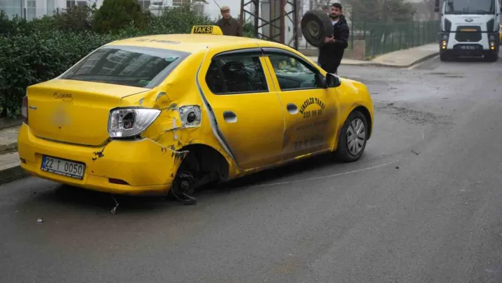 Kaza, Edirne Kocasinan Mahallesi Sadık Ahmet Caddesi üzerinde meydana geldi. Edinilen bilgiye göre, Soner T. kontrolündeki 22 T 0050 plakalı ticari taksi ile Cüneyt Ç. idaresindeki 34 FBJ 820 plakalı otomobil çarpıştı. Çarpışmanın şiddetiyle ticari taksinin arka sağ tekerleği yerinden koparken, 2 kişi ise yaralandı.