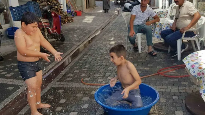Balıkesir'in Edremit ilçesinde esnaf, çocuklarının serinlemesi için çareyi sokağa leğen koymakta buldu. Çocukların leğende oyun oynayarak serinlemesi ise renkli görüntülere sahne oldu.