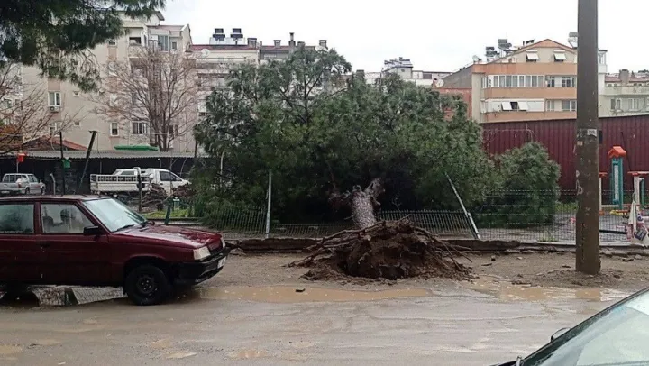 Balıkesir'in Edremit ilçesinde etkili olan yağmur, çam ağacını devirdi.